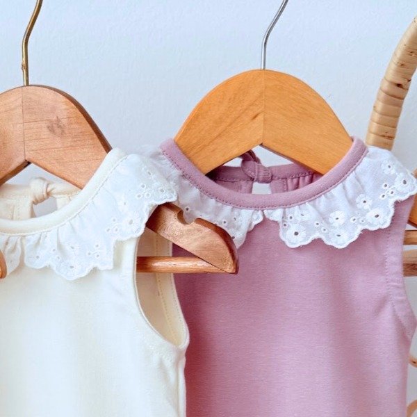 Body confeccionado en algodón elastizado con cuello con volados en broderie